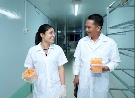 Hiện nay, ngoài sản phẩm tươi thu hoạch được bình quân mỗi ngày 500kg, trong đó 50% dùng cho chế biến, còn lại bán tươi. Do nhu cầu thị hiếu khách hàng ưa chuộng dùng nấm Đông trùng Hạ thảo sấy khô để hãm trà, chế biến một số loại thức ăn do có nhiều dược tính bổ trợ sức khỏe, gia đình chị đầu tư 04 máy sấy thăng hoa công suất lớn để nấm sấy khô giữ 99% hàm lượng dưỡng chất, nguyên sơi, màu sắc và mùi vị giúp cho nấm sấy khô bảo quản được lâu, tránh bị hư hỏng.